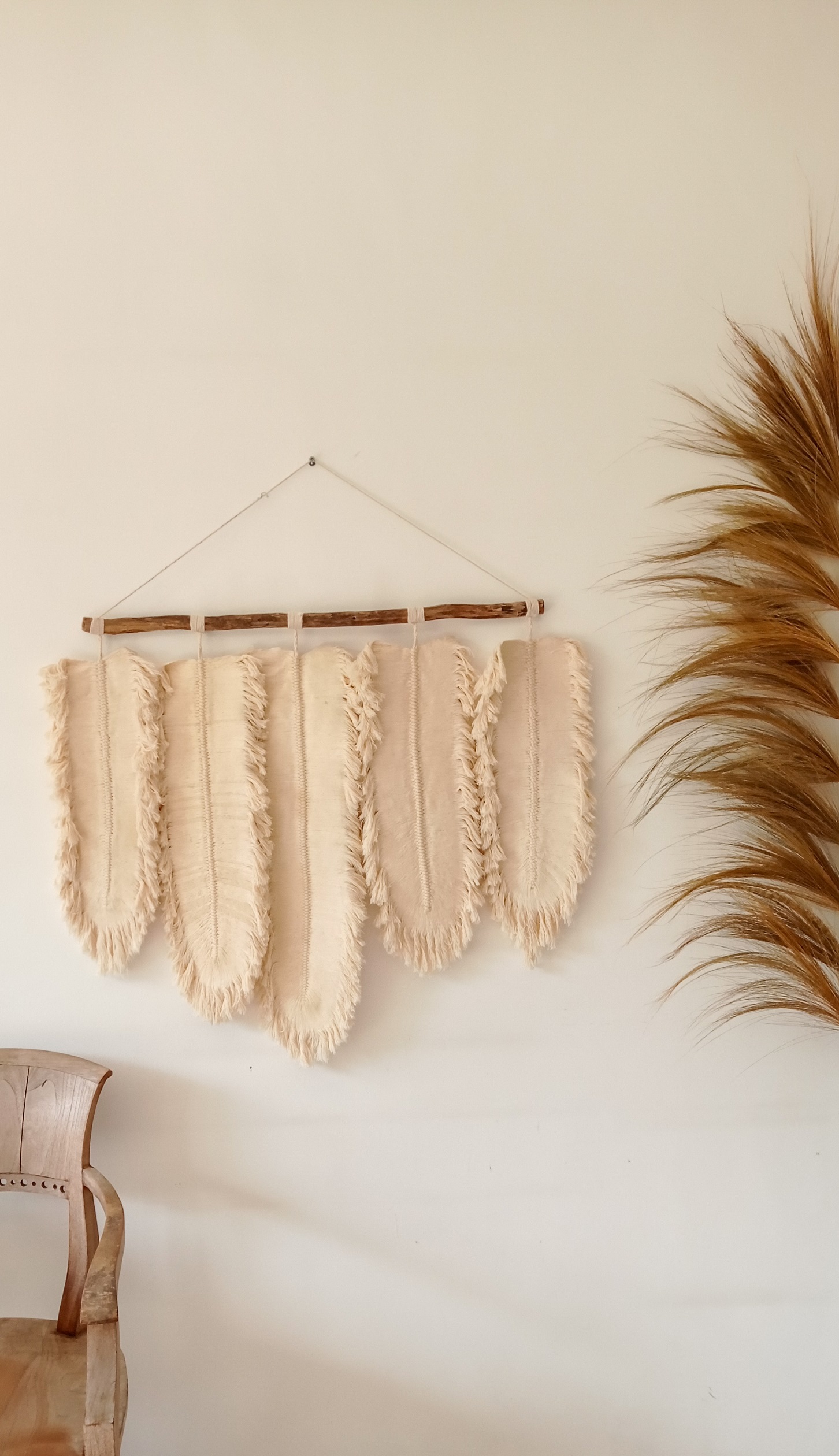 Dekoracja ścienna makrama Pięć Liści – makramy przeżywiają swój wielki „come back”. Ta z kolekcji Monnarita jest wyjątkowa – piękne liście w kolorze białym, wykonane techniką makramy z bawełnianego sznurka, zostały zawieszone na naturalnej, ciemnej gałązce. Ten niebanalny dodatek w stylu boho ożywi każdą przestrzeń i przyciągnie wzrok.