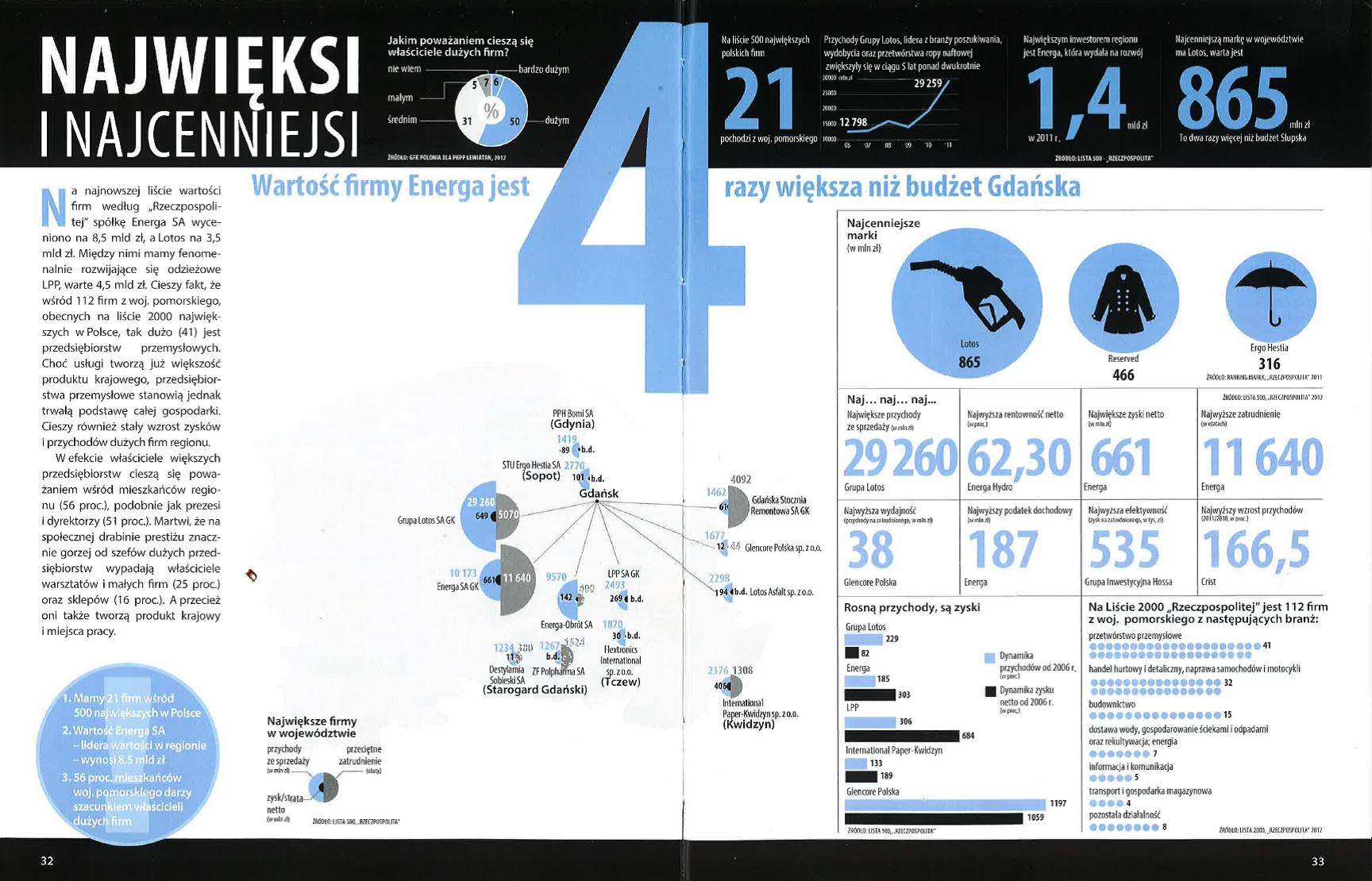 – Pomorze to zdecydowanie jeden z najdynamiczniej rozwijających się regionów w Polsce, w którym powstaje 5,7% polskiego PKB. To w dużej mierze zasługa przedsiębiorstw prowadzących działalność na tym obszarze. Świetnym przykładem jest Grupa ENERGA, której wartość szacowana przez rynek w 2011 roku na 8,5 mld zł czterokrotnie przewyższała budżet Gdańska, dając firmie pozycję lidera wśród najcenniejszych firm na Pomorzu. Dla przykładu wartość sklasyfikowanego na drugim miejscu Lotosu to 3,5 mld zł – podsumowuje Jeremi Mordasewicz, doradca Zarządu PKPP Lewiatan. – O wysokim tempie wzrostu spółki świadczy również dynamika jej zysku netto, która od 2006 roku wyniosła 303%.